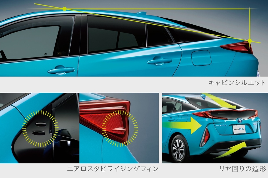 全高を低く抑えて、正面から見た時のボディ面積を小さくすると同時に、ルーフ頂点とリヤスポイラーの高さを最適化したキャビンシルエットで空力性能を高めました。また、ドアミラー前方やリヤコンビネーションランプ側面にはエアロスタビライジングフィンを配置。さらに、後方への空気の流れを整えるリヤバンパーコーナー、上面を整流するダブルバブルウインドゥ、下面の気流を最適化するリヤ回りの造形など、数々の工夫が、走りの安定感や燃費、静粛性の向上に貢献しています。